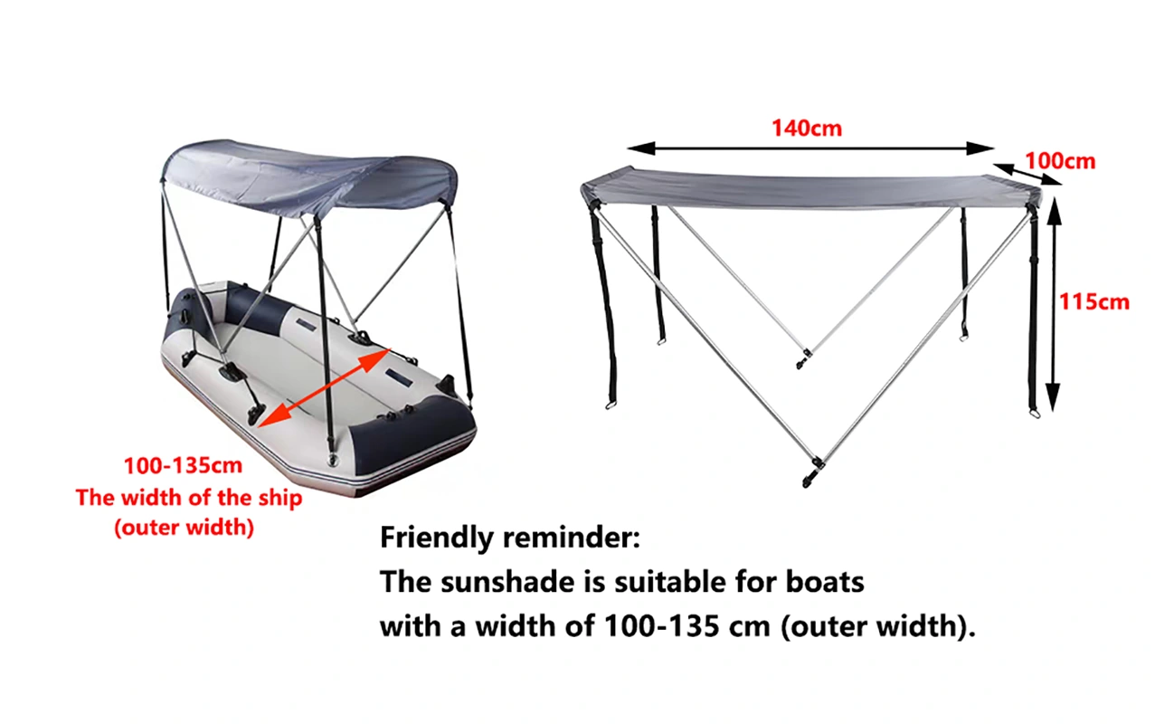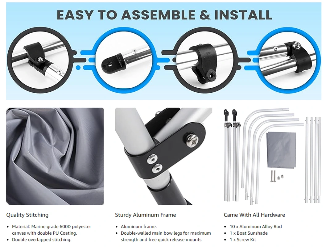 Alyuminiy cho'ziladigan qayiq kanopi. Puflanadigan qayiq, kanoe, kayak, baliq ovlash qayig'i uchun mos keladi. Bizning qayiq soyamiz sizni quyosh va yomg'irdan saqlaydi, Runabout qayiqlari, V-Hull qayiqlari, Jon qayiqlari, bass qayiqlari, puflanadigan qayiqlar, shisha tolali qayiqlar uchun ideal Zhejiang Jiayu Outdoor Products Co., Ltd hech qanday maxsus bo'lmagan holda bir necha daqiqada bajarilishi mumkin. asboblarni osongina va tez o'rnatishingiz mumkin.