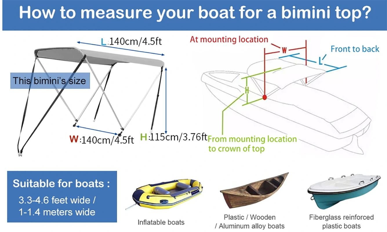 Kanopi 210D Oksford matodan, namlikka chidamli, yomg'irga chidamli. 210D dengiz toifasidagi material Bimini tepasi - bu dengiz uchun ko'p funksiyali quyosh soyabon soyabon bo'lib, u quyosh issiqligiga qarshi tura oladi va sizni va oilangizni dengizda xavfsiz qulay va bepul tajribadan bahramand bo'lishingiz uchun saqlab qoladi.
