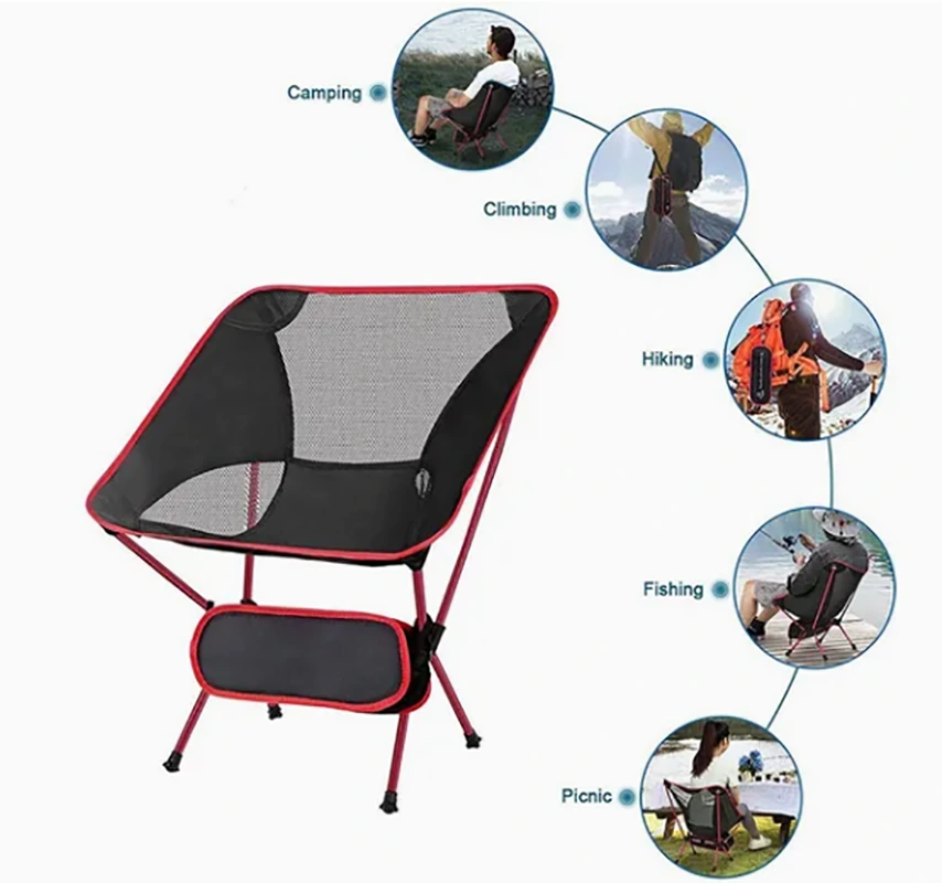 Orqa tomondan commerting Portativ stul, ko'chma va katlanadigan strelka: oddiy stul 1,5 kg va katta o'lchamda 2 kg atrofida. Bundan tashqari, stul bir qadamda saqlanishi mumkin, uni olib yurish uchun juda mos keladi.