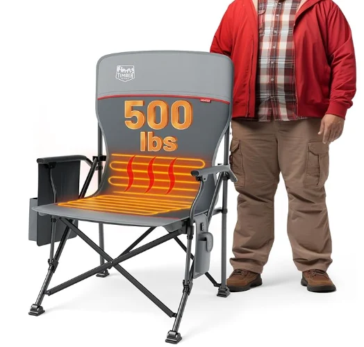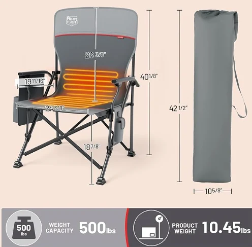 Shaxsiy isitiladigan katlanadigan stul, orqa va o'tiradigan joylar uchun ikki marta isitish zonalari 131 ° F ga qadar atigi 10 soniya ichida. Uchta issiqlik sozlamalari (104 ° F, 122 ° F, 131 ° F) har qanday ochiq vaziyatda iliqlikni ta'minlaydi (batareya kiritilmagan).