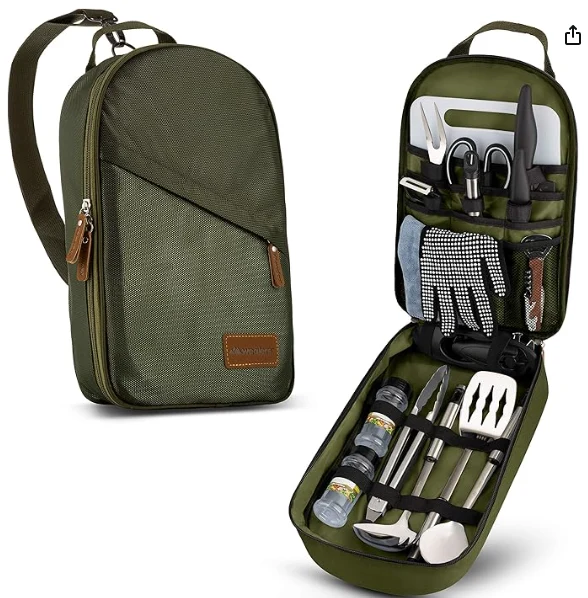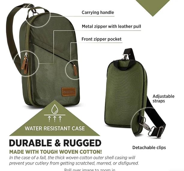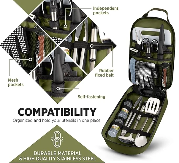 Har bir idish-tovoq sumkali portativ qopqoqning o'ziga xos sumkasiga ega, shuning uchun birliklar sutilab qo'yilmaydi, tirnalgan yoki tranzitda shikastlanmaydi. Pishirish idishlariga oson kirishni ta'minlaydi va u xavfsiz zip muhr bilan jihozlangan